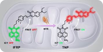 在本工作中,我们采用分子内电荷转移-荧光共振能量转移(ICT-FRET)机制,设计了一种用于定量监测NTR的比率型双光子荧光探针。如图1所示,我们设计了一种硝基衍生的萘酰亚胺,以实现ICT传感模式,其中硝基作为NTR特异性的响应单元,可被NTR还原形成氨基萘酰亚胺结构并激活ICT过程。此外,我们发现萘酰亚胺的发射光谱与吡啶-香豆素的吸收光谱高度匹配。因此,萘酰亚胺单元可以有效地作为能量供体。基于ICT-FRET响应策略,我们开发了一种比率型荧光探针IFRP,该探针能够高灵敏度、快速对NTR响应,检测范围为1.0至9.0 μg mL-1。我们使用比率型荧光探针IFRP对神经元线粒体内的NTR进行了实时成像,并观察到NTR水平与缺氧程度之间的相关性。