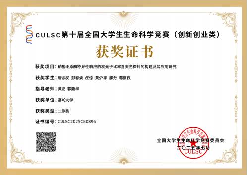 学子积极参与各类科研项目,勇攀科学高峰,涌现出一批优秀成果。本系列将陆续展示这些闪耀着智慧与汗水的科创故事。本期聚焦化学工程与工艺专业2022级本科生唐志权及其团队在比率荧光检测硝基还原酶方面取得的最新成果。